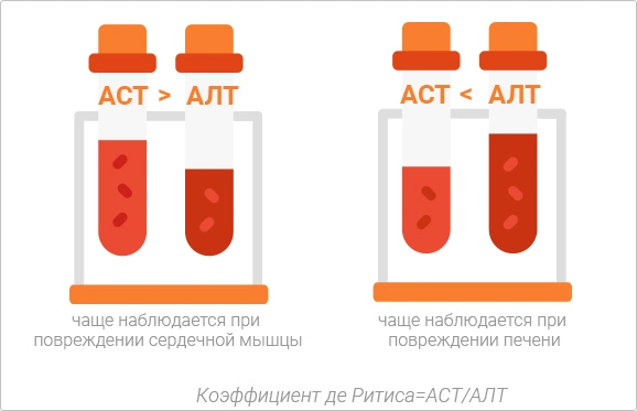 Чаще всего показатели АСТ и АЛТ могут увеличиваться при заболеваниях печени и инфаркте миокарда. Для различения этих состояний специалисты используют соотношение уровней АСТ к АЛТ (коэффициент де Ритиса). Если увеличение АСТ оказывается больше, чем увеличение АЛТ, это обычно указывает на поражение сердечной мышцы. Когда уровень АЛТ повышается больше, чем уровень АСТ, врачи делают вывод о поражении гепатоцитов с цитолизом1,3.