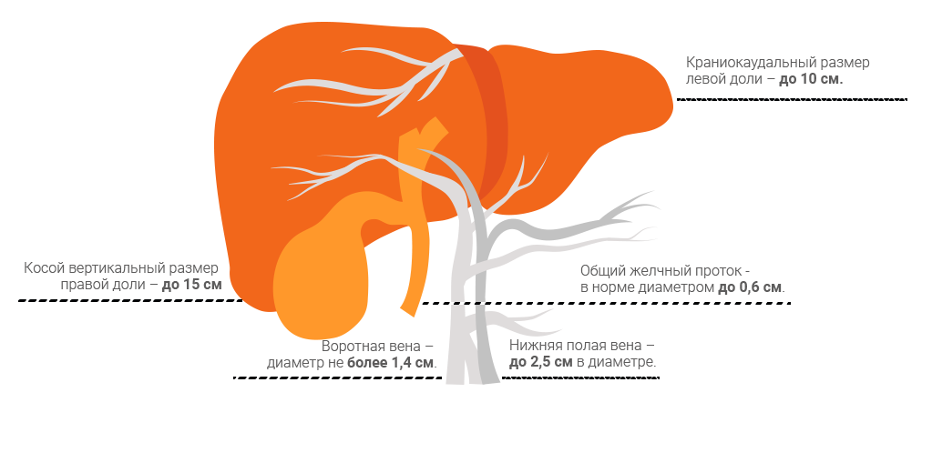 В норме печень имеет однородную структуру средней эхогенности (сопоставима с эхогенностью почек), четкие контуры и неувеличенные размеры.2 Объемные образования в норме не выявляются.